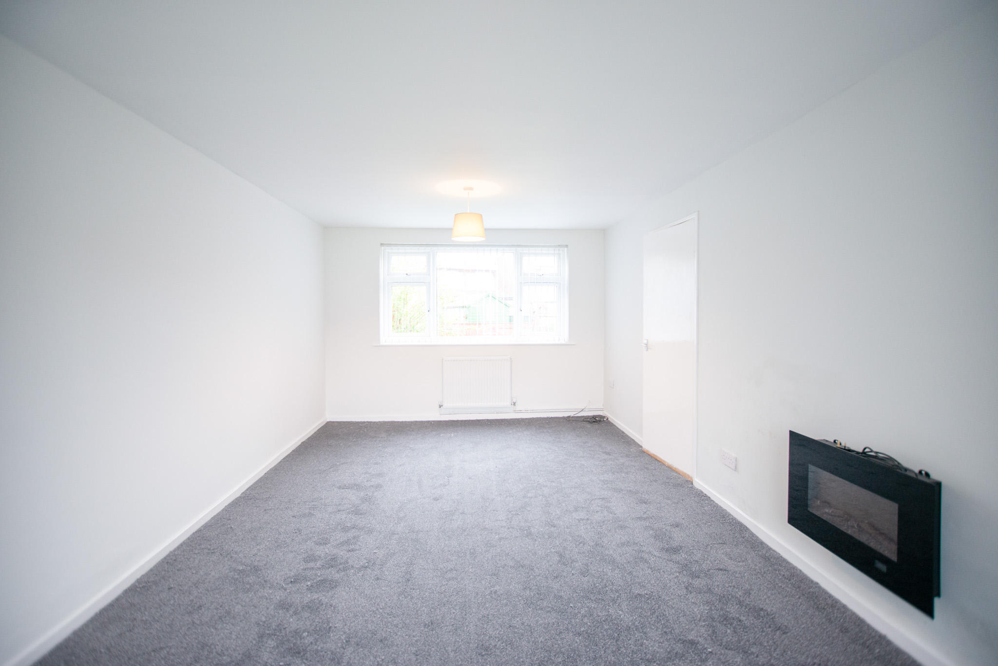 The ground floor comprises an entrance hall, a large living room with an electric fireplace, and a modern kitchen with a new built-in fridge freezer, hob, and oven. The first floor has two double bedrooms, both with additional storage cupboards and a newly fitted three-piece bathroom suite.