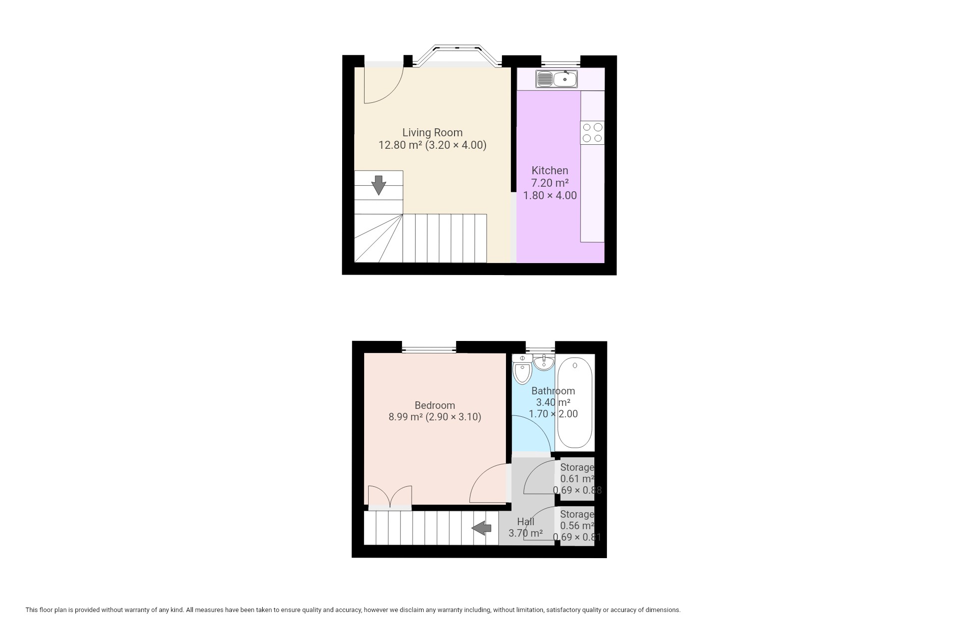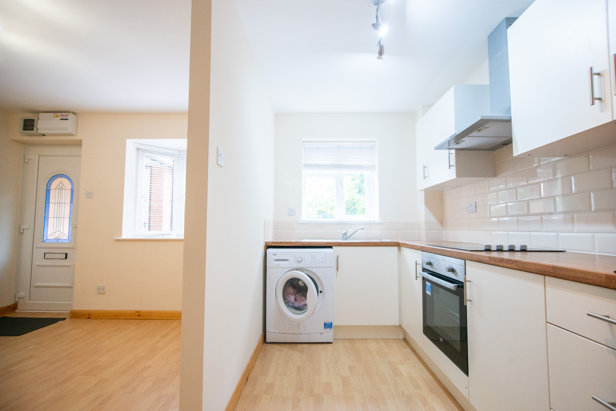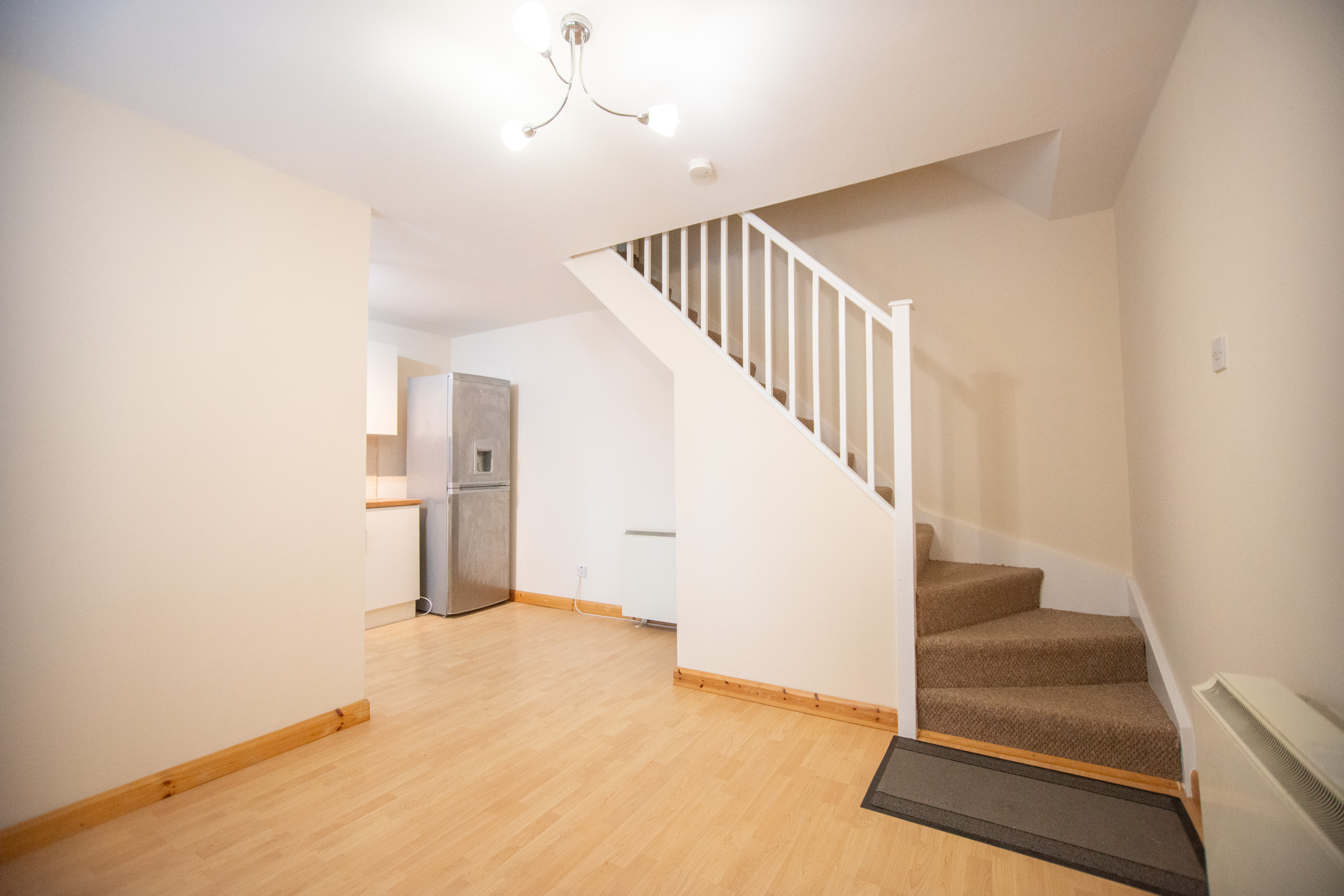 This property comprises an open-plan living/kitchen space with room for a small dining table and chairs. In the kitchen, you'll find a built-in hob and oven and a free-standing washing machine and a fridge. Upstairs is where you'll find the double bedroom and the three-piece bathroom.