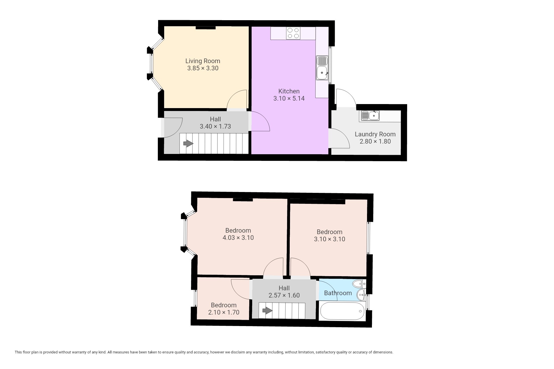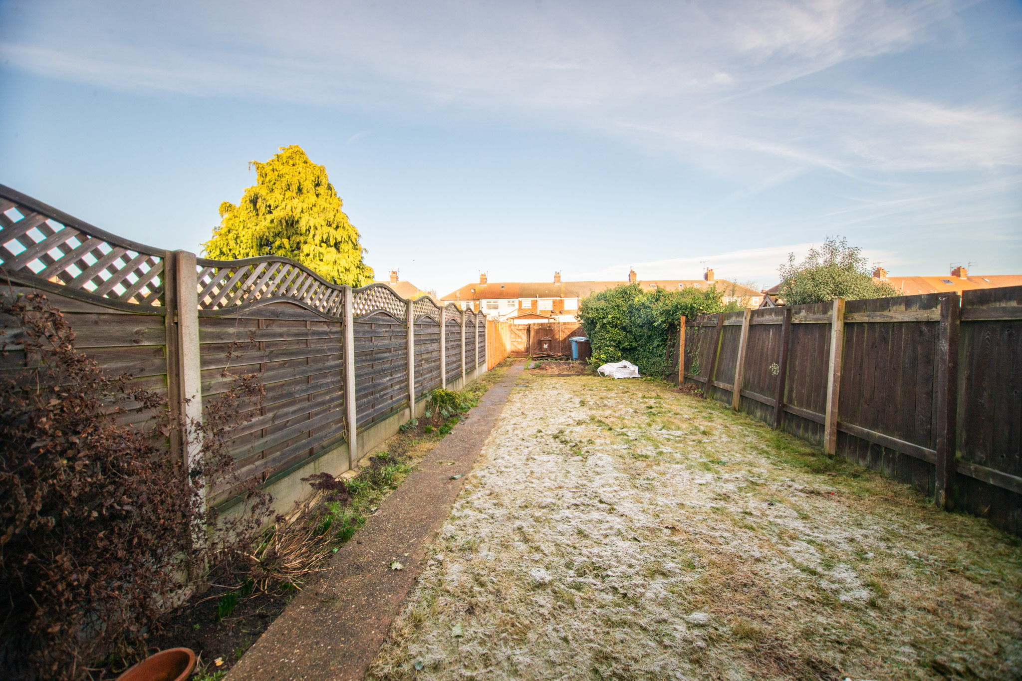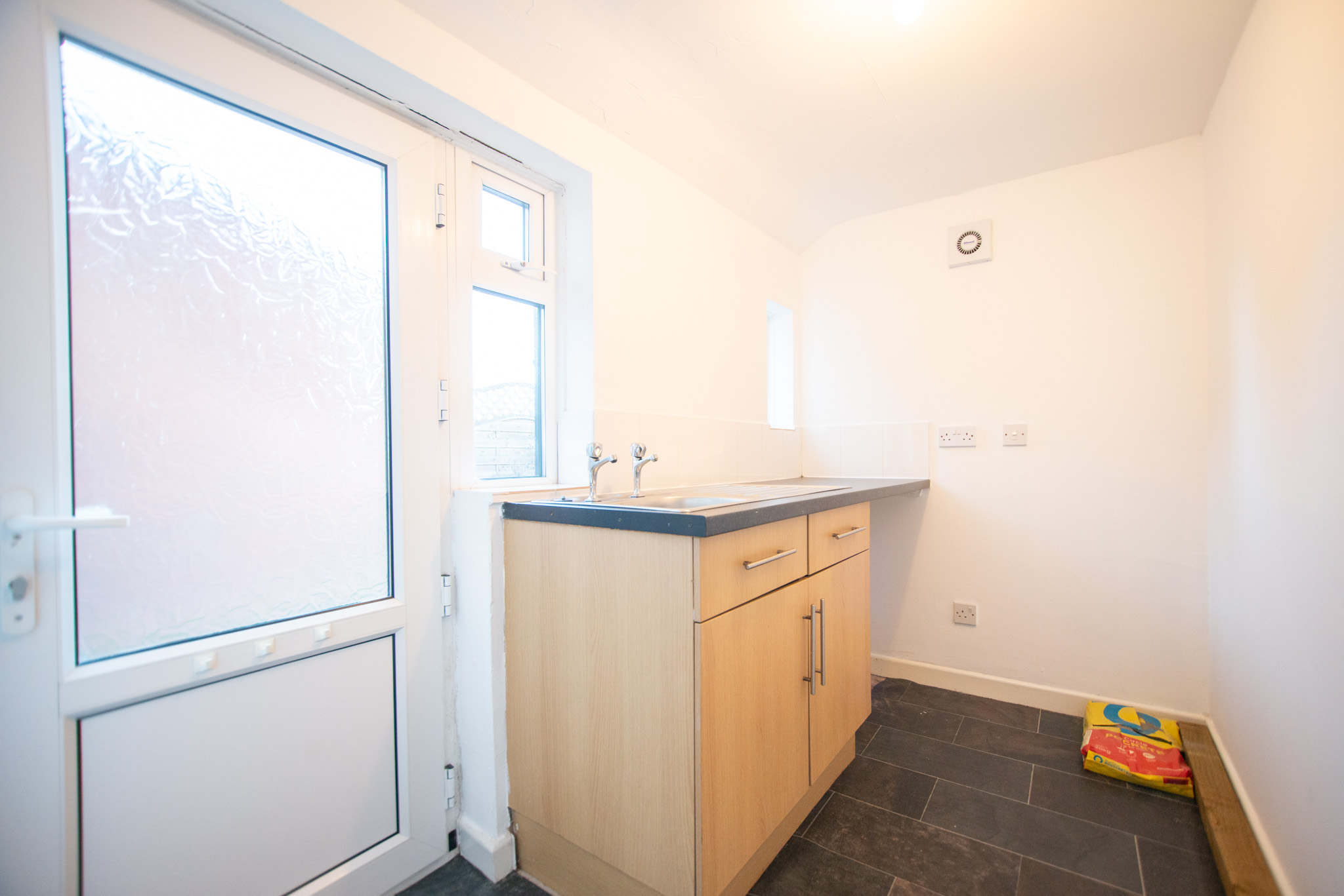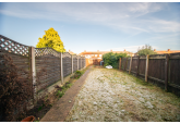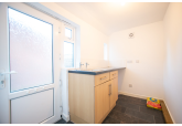 The property features a welcoming entrance hall that leads to a living room with a bay window, a kitchen with a built-in hob and oven and enough space for a table and chairs and a utility room with a sink that leads to the spacious rear garden. Upstairs, there are two double bedrooms, one single and a sleek bathroom with a shower over the bath.