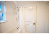 The property comprises an entrance hall, a carpeted living room with a small bay window, a kitchen with a built-in hob and oven, a fridge freezer and a free-standing washing machine, a double bedroom and a bathroom with a shower over the bath.