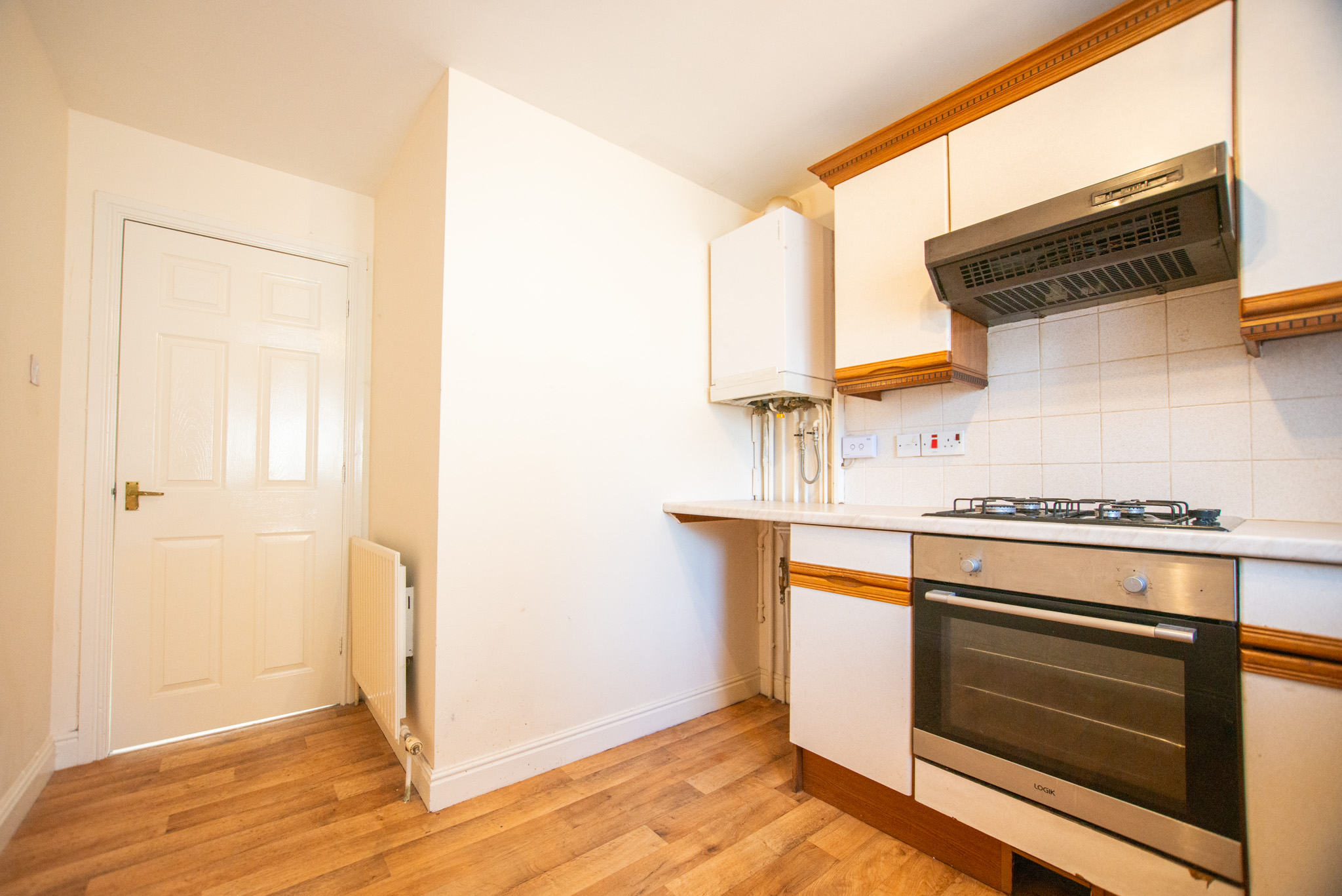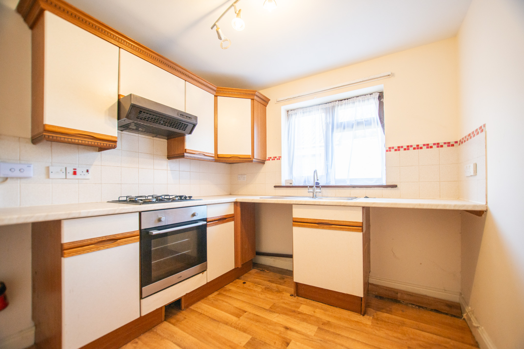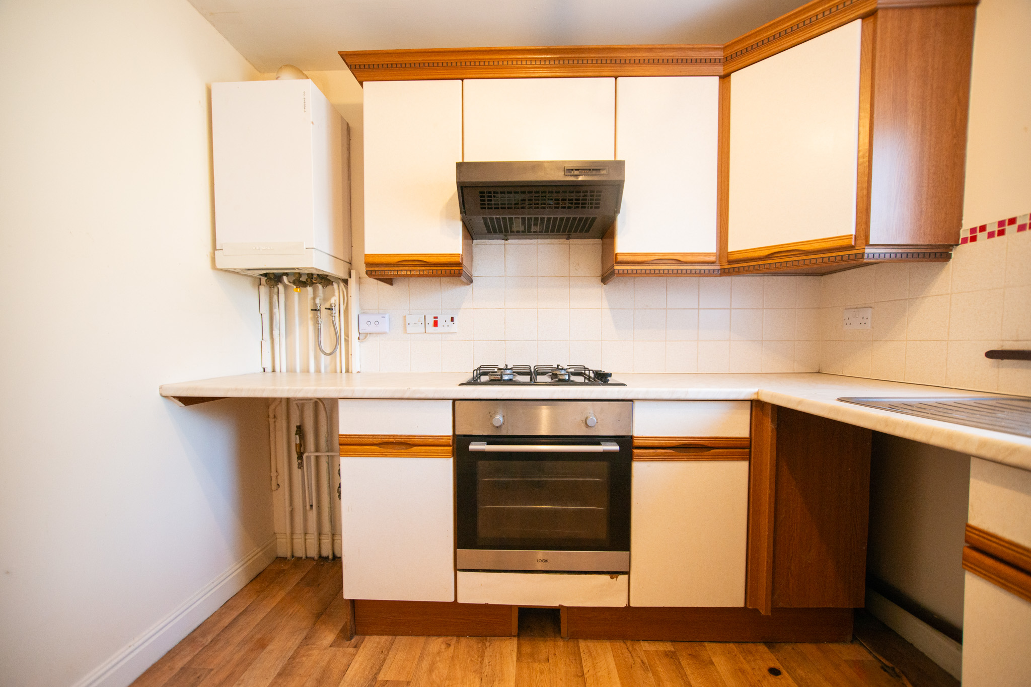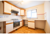 This flat comprises an entrance hall, a good-sized living room, a kitchen with a built-in hob and oven, two bedrooms and a bathroom with a shower over the bath.