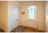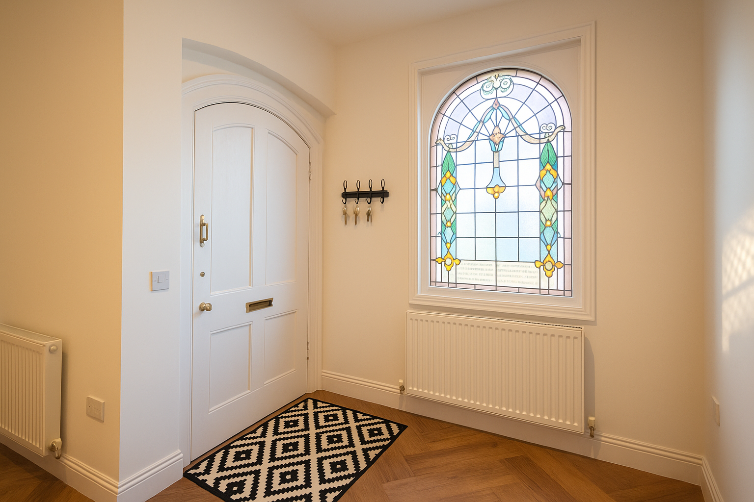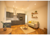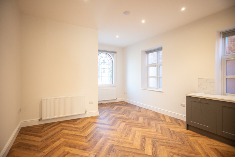Upon entering, you’ll be welcomed by a spacious open-plan living and kitchen area, complete with high-end integrated appliances. The property boasts elegant wooden herringbone flooring, while an original stained-glass window at the front adds a touch of historic charm. There are also two double carpeted bedrooms and a modern shower room to the rear.