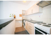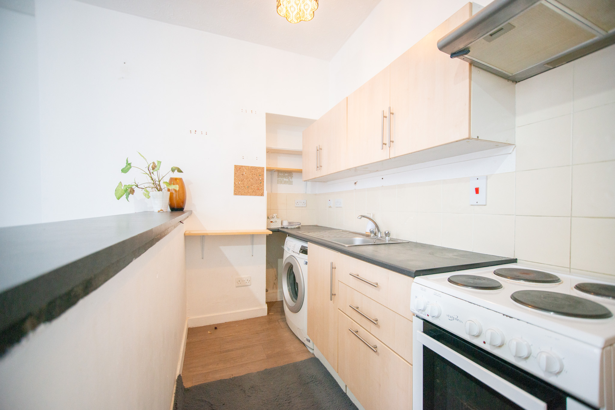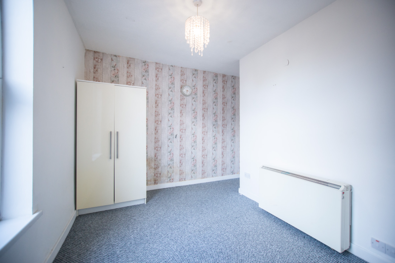 The flat comprises an entrance hall, a bright open-plan living/kitchen with a free-standing hob and oven and washing machine. A carpeted double bedroom and a bathroom with a shower over the bath.