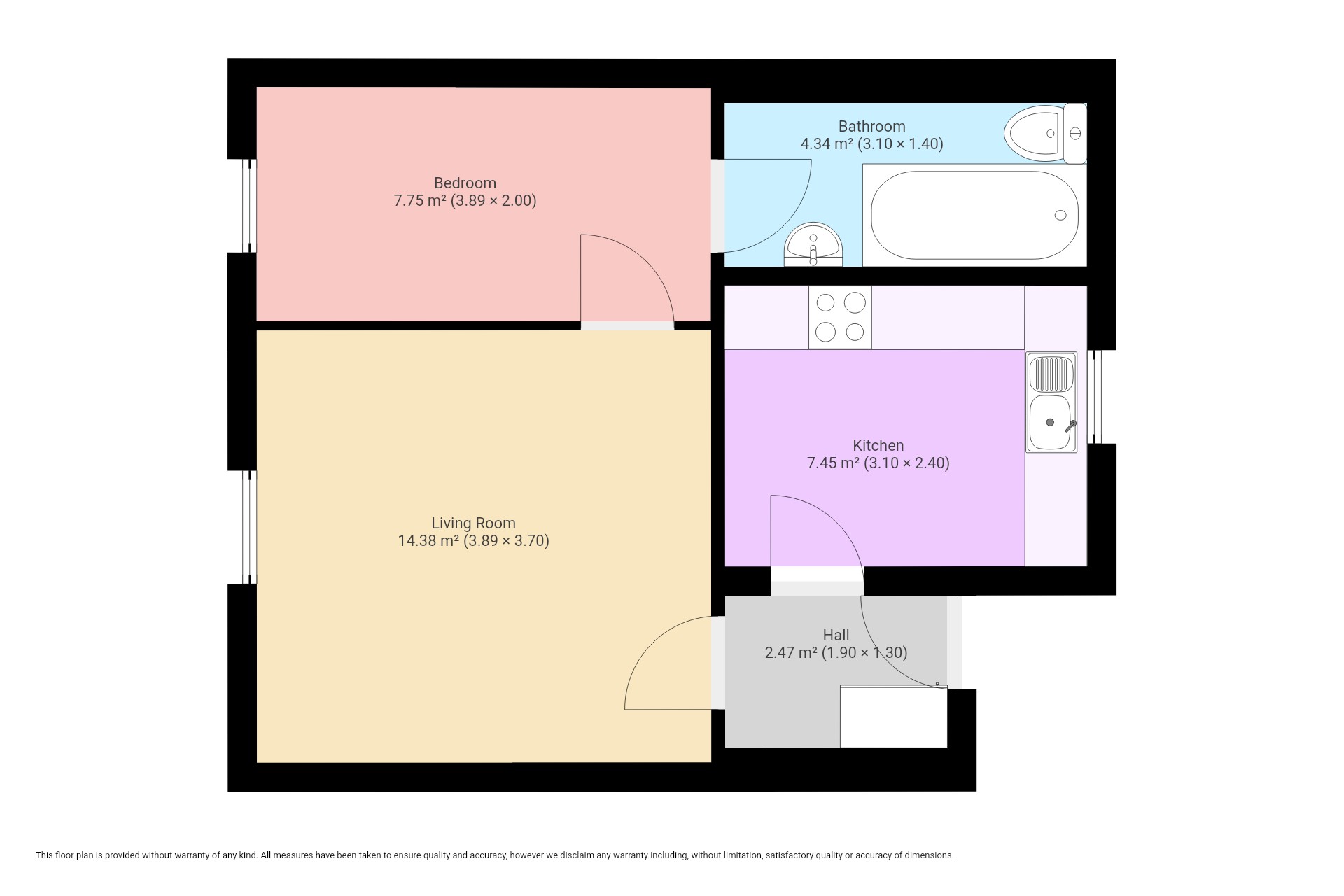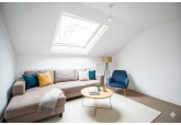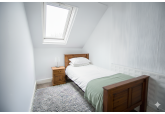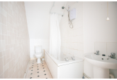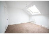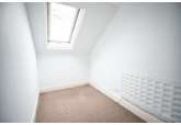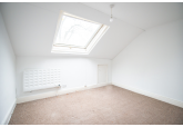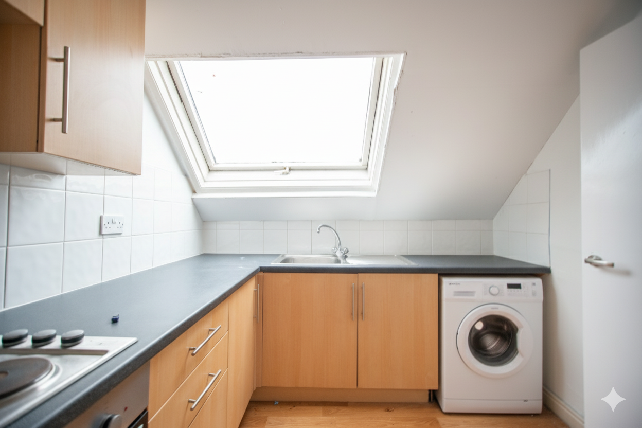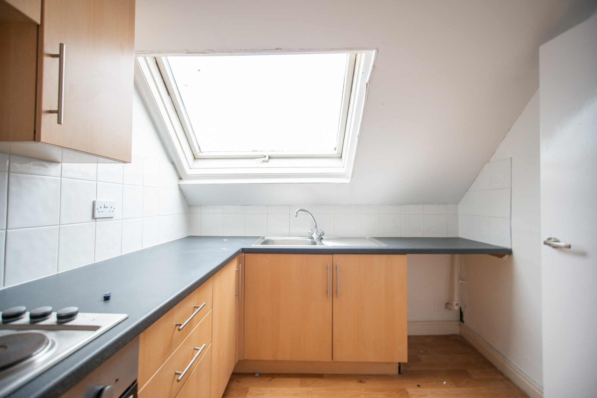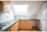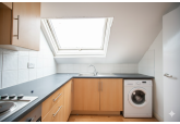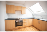 This flat comprises an entrance hall, a bright kitchen to the right with a built-in hob and oven, a living room with a Velux window, a double bedroom and a bathroom off this room with a shower over the bath.