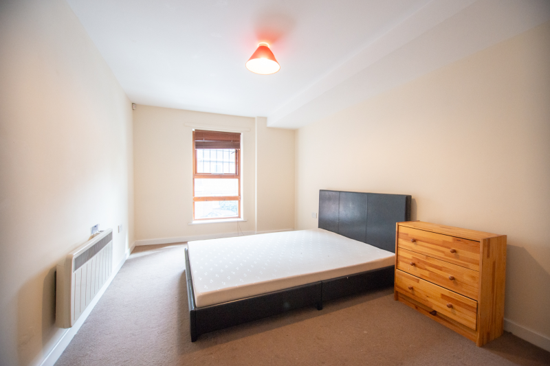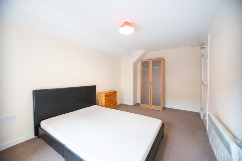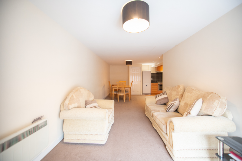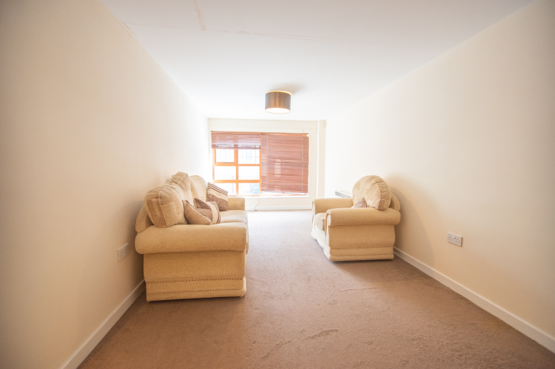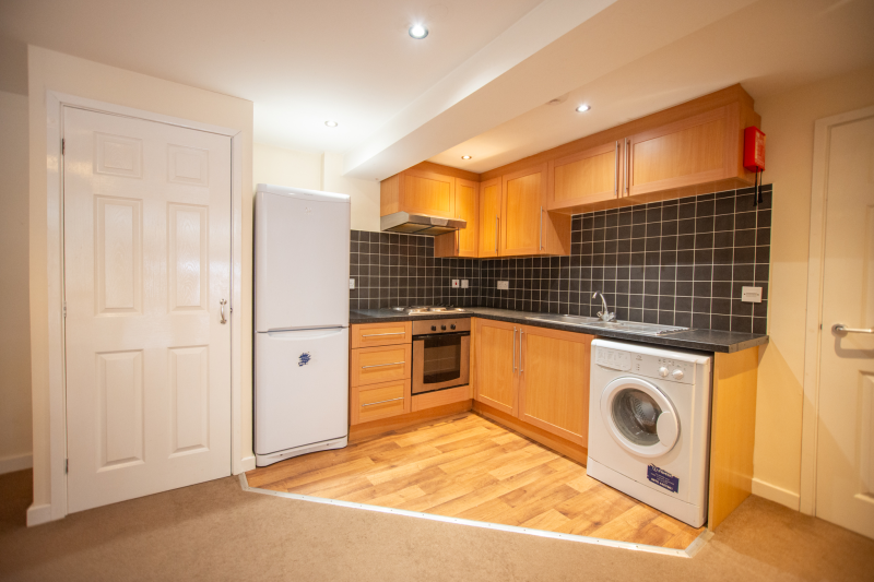 The flat comprises a spacious entrance hall, a double bedroom, a three-piece bathroom suite, and a large living room/kitchen with a built-in oven and hob and a free-standing fridge and washing machine.