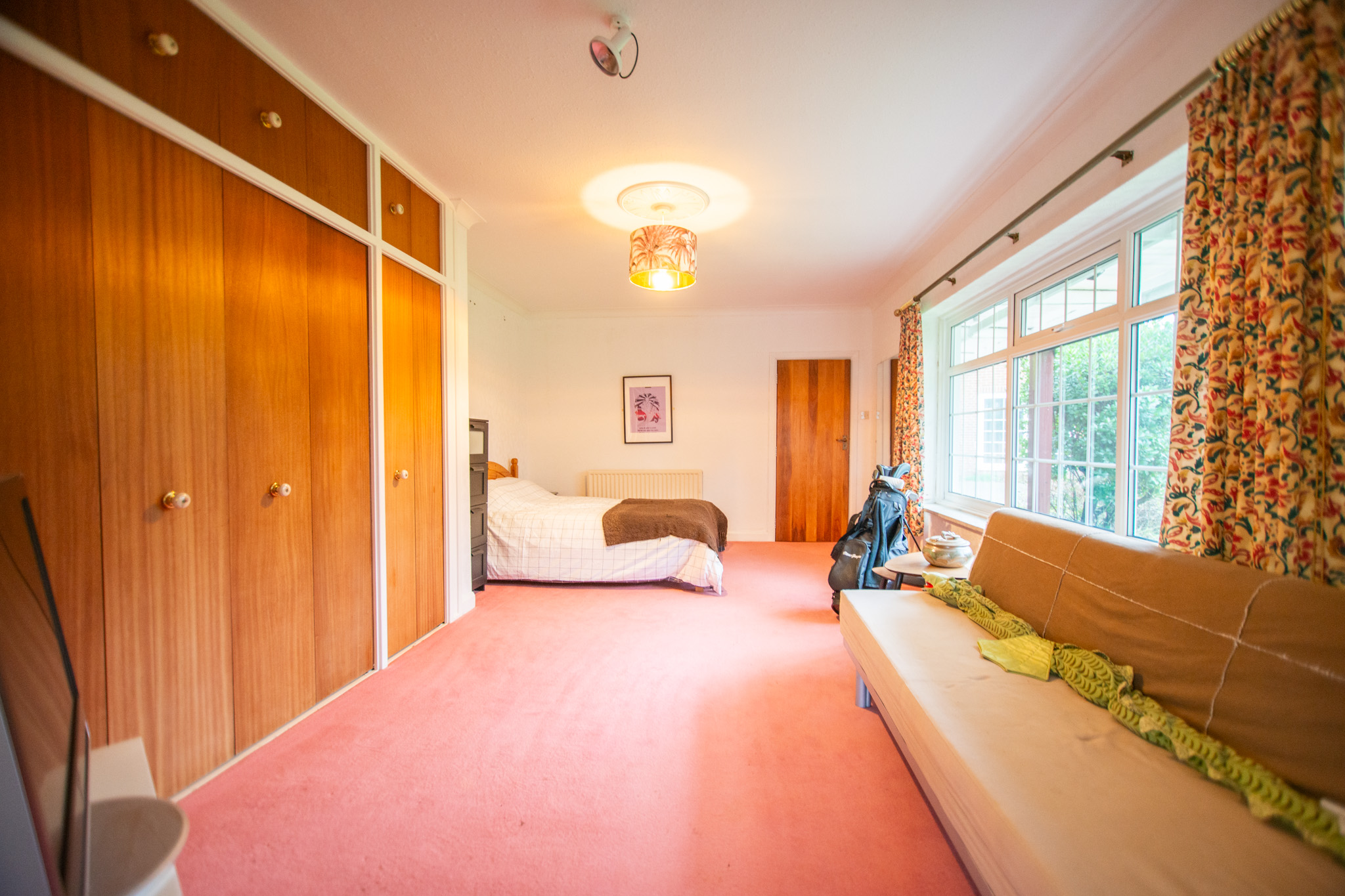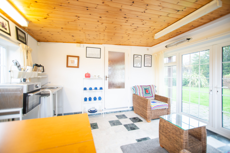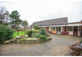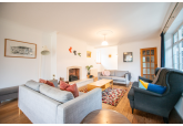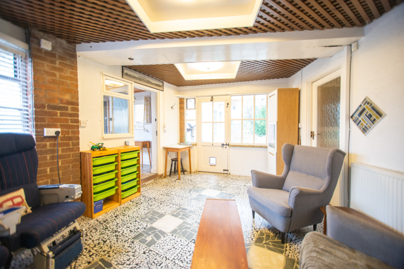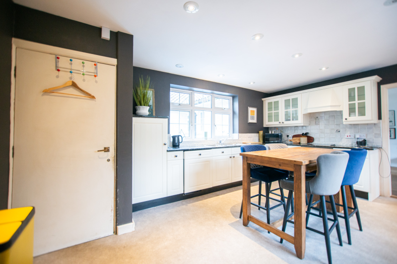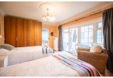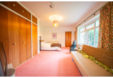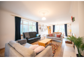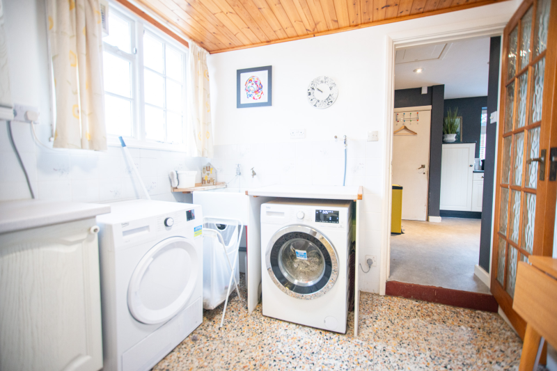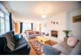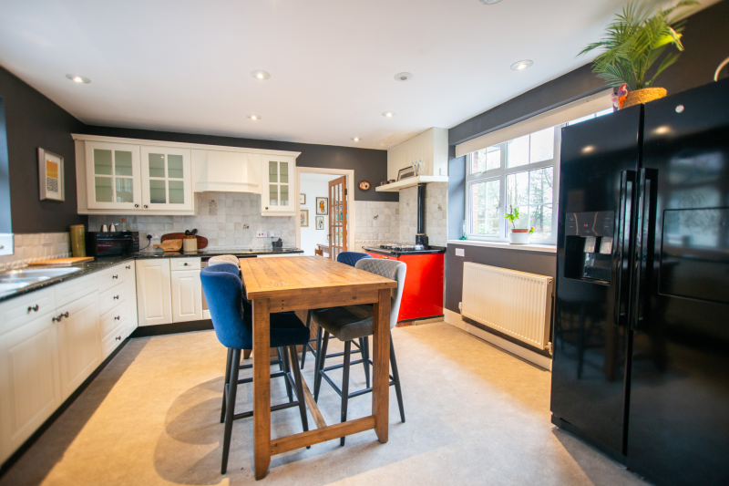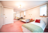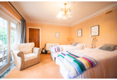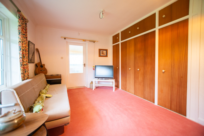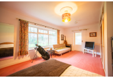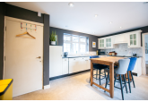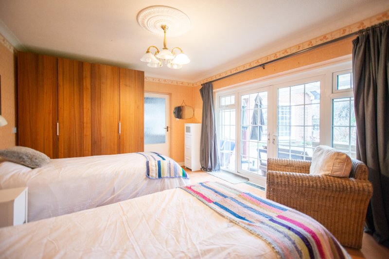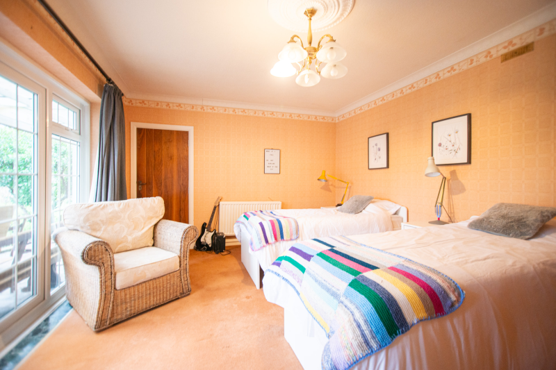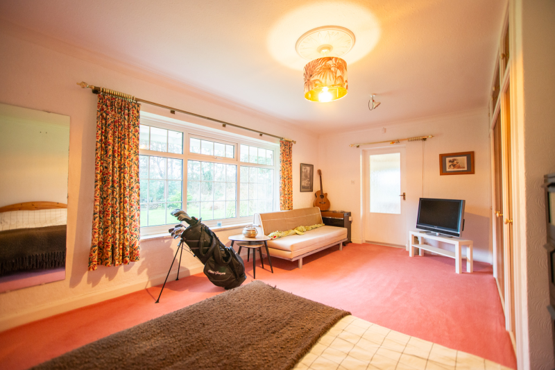 Beyond the kitchen, the layout continues into a utility room and then into a large, flexible open-plan area that could serve as a playroom, second lounge, home office, or entertainment space. This leads to an additional bedroom with patio doors opening directly onto the garden. From here, a hallway provides access to a second family bathroom and the final bedroom, which features a full wall of fitted wardrobes and access to the garden room. Currently arranged as a secondary kitchen/living area, the garden room also benefits from patio doors leading outside.