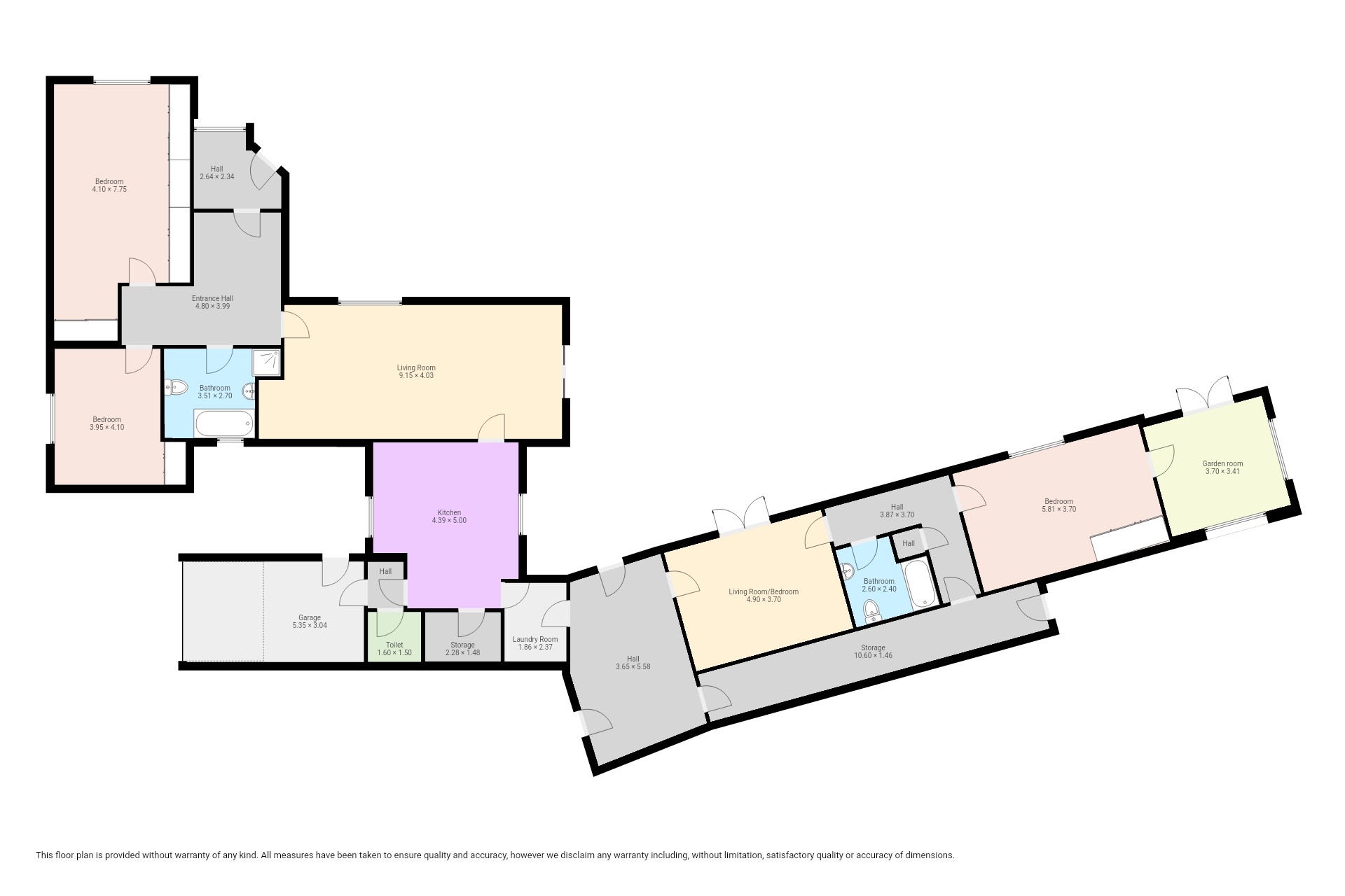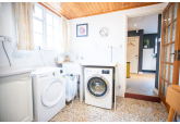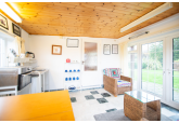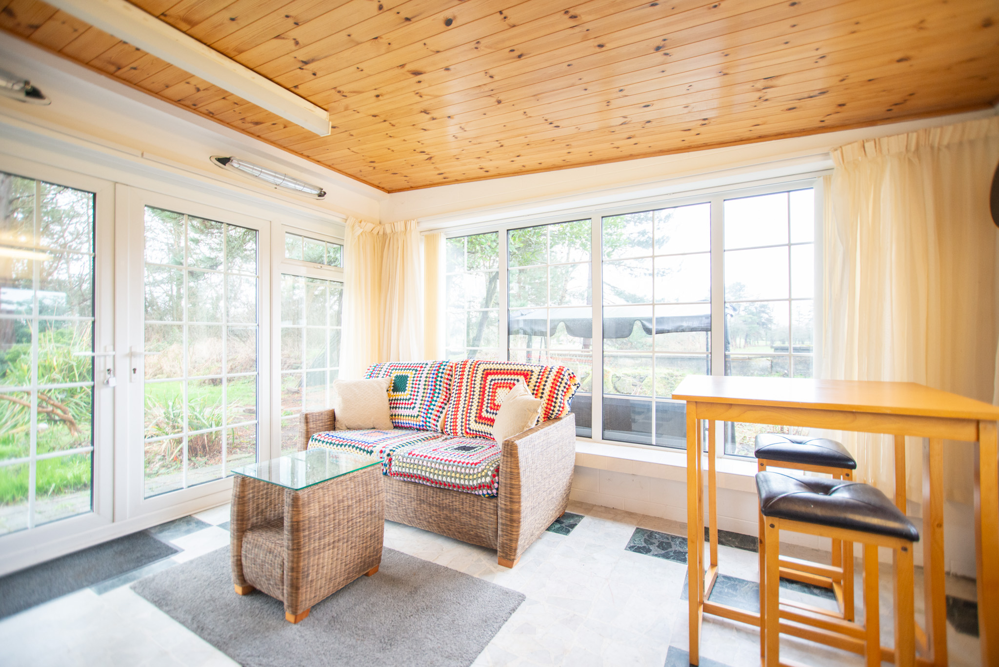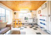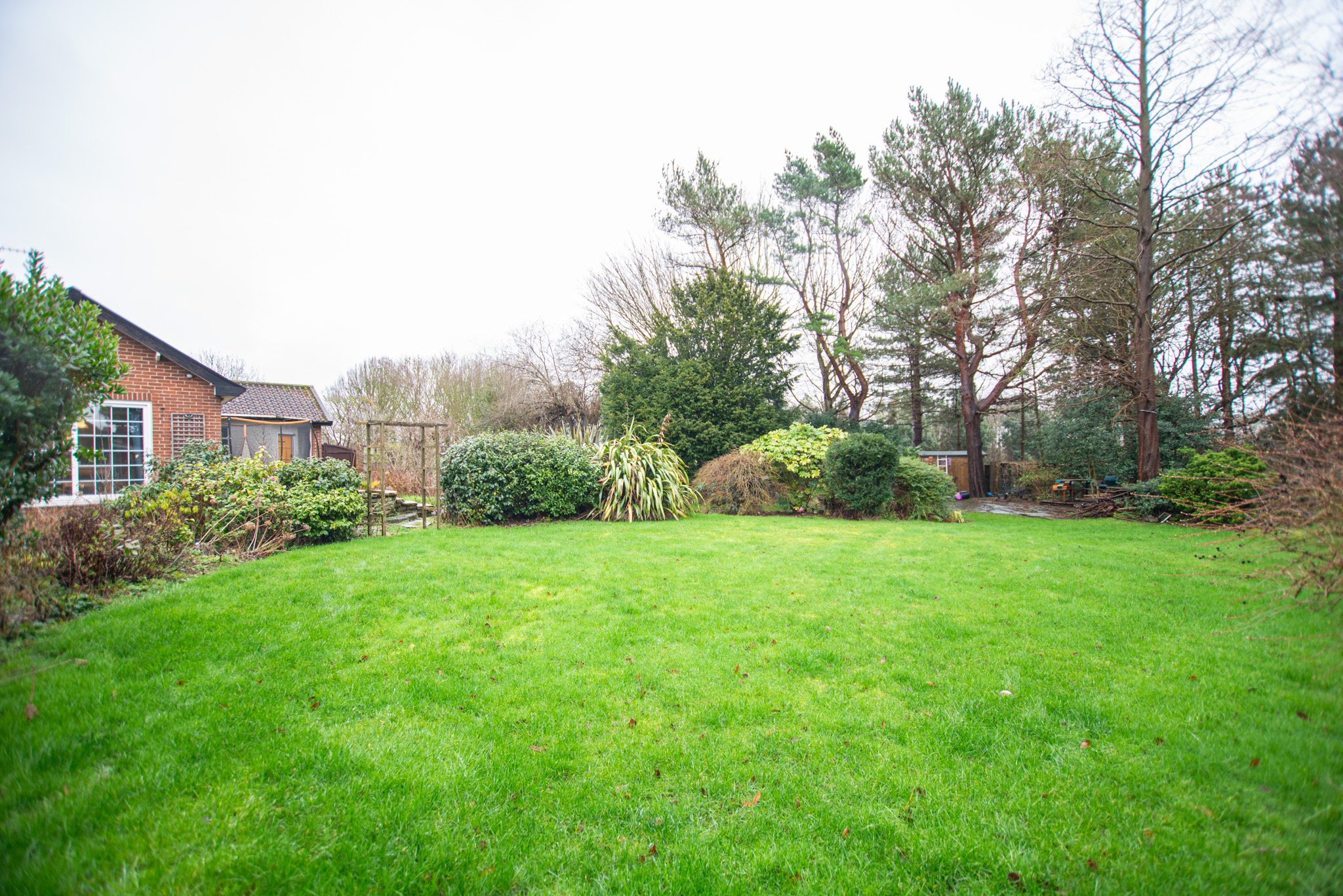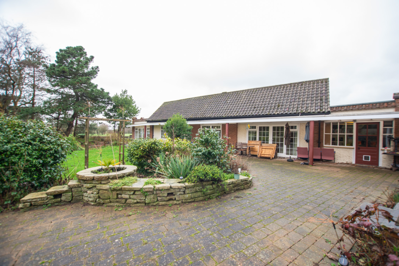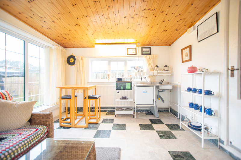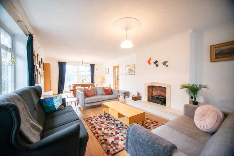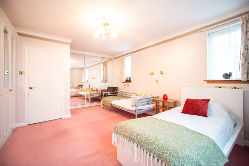 Beyond the kitchen, the layout continues into a utility room and then into a large, flexible open-plan area that could serve as a playroom, second lounge, home office, or entertainment space. This leads to an additional bedroom with patio doors opening directly onto the garden. From here, a hallway provides access to a second family bathroom and the final bedroom, which features a full wall of fitted wardrobes and access to the garden room. Currently arranged as a secondary kitchen/living area, the garden room also benefits from patio doors leading outside.