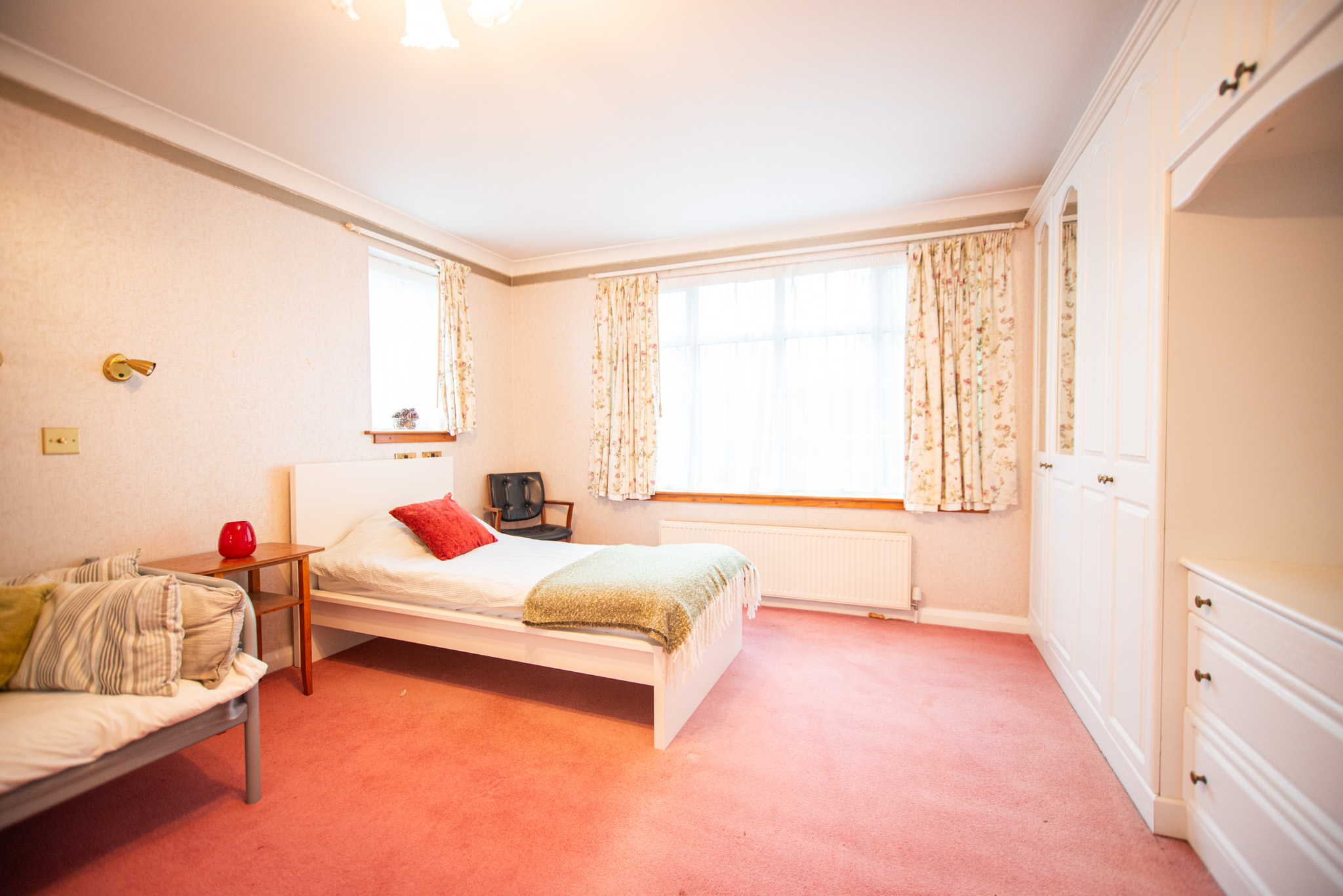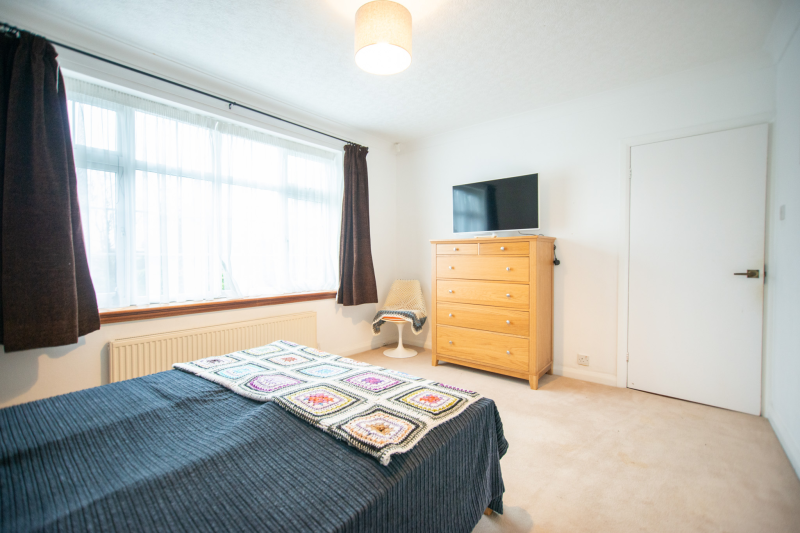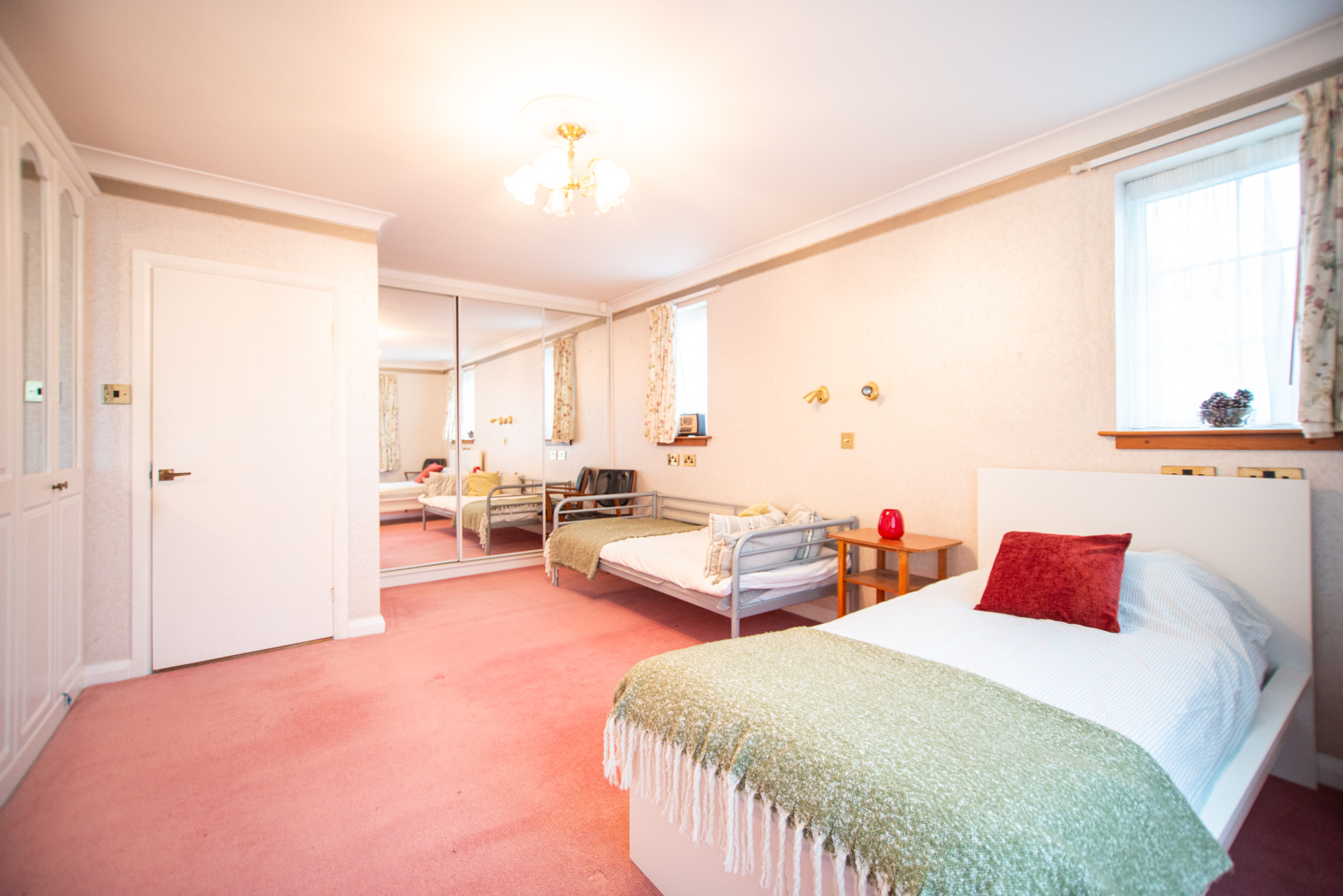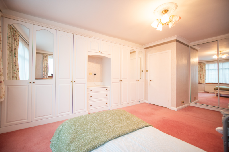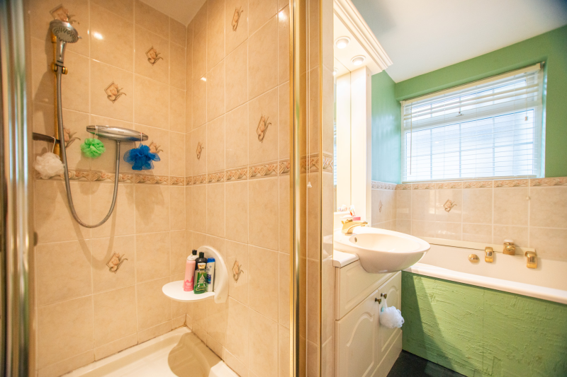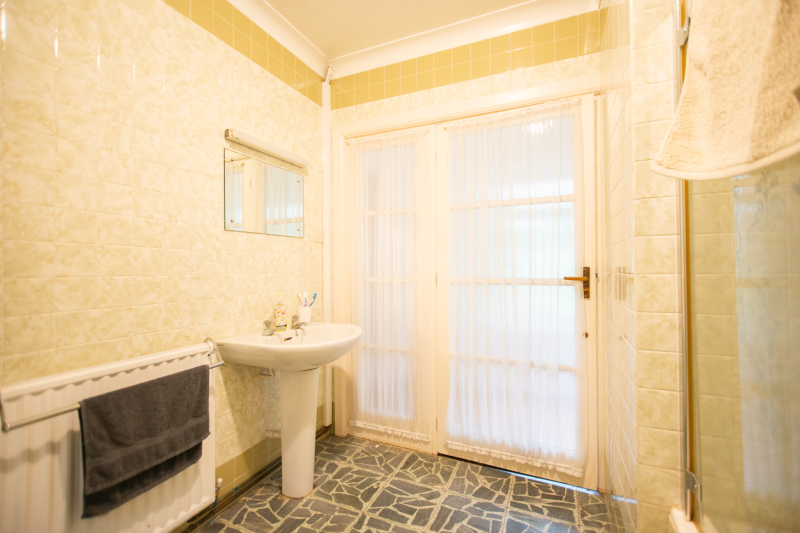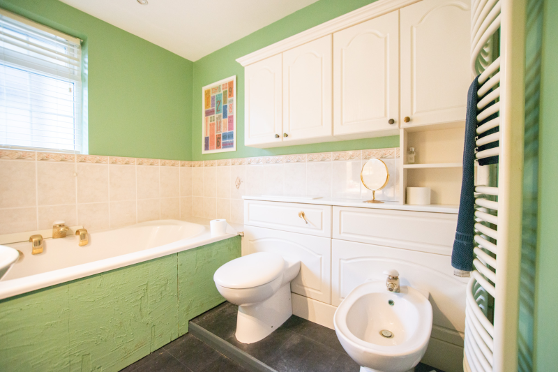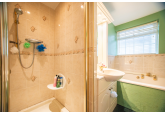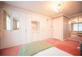 This spacious and versatile home opens into a welcoming entrance porch, complete with built-in seating perfect for removing shoes and coats. From here, you step into the main hallway, which provides access to the first two bedrooms. The larger bedroom boasts two full walls of fitted wardrobes, offering exceptional storage, while the second bedroom also benefits from a built-in cupboard. A well-appointed family bathroom on this side of the house features both a bath and a separate shower.