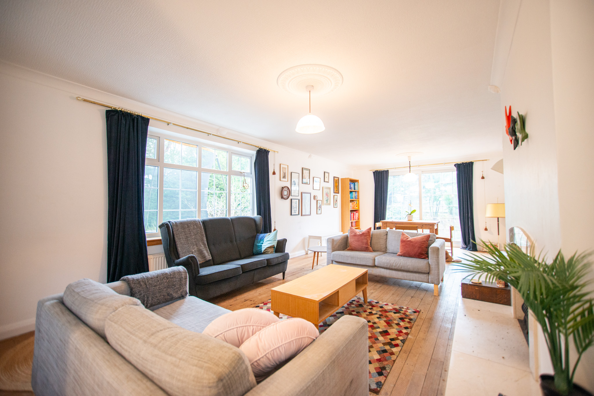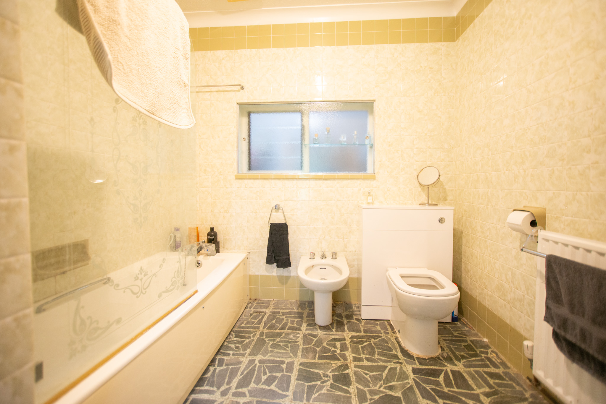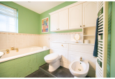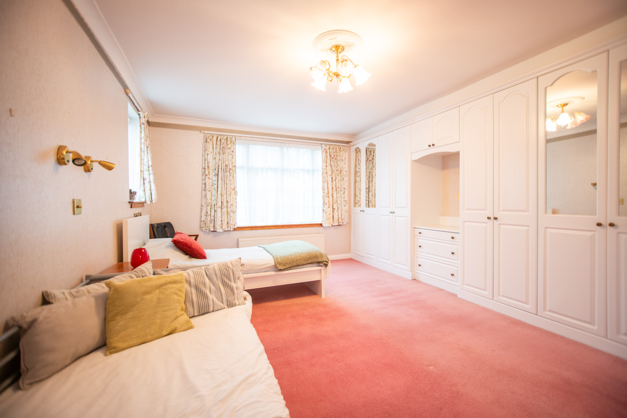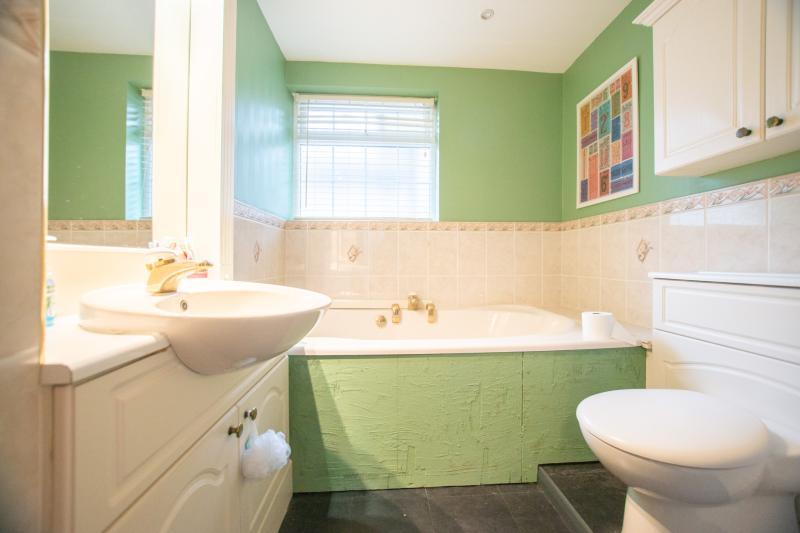 This spacious and versatile home opens into a welcoming entrance porch, complete with built-in seating perfect for removing shoes and coats. From here, you step into the main hallway, which provides access to the first two bedrooms. The larger bedroom boasts two full walls of fitted wardrobes, offering exceptional storage, while the second bedroom also benefits from a built-in cupboard. A well-appointed family bathroom on this side of the house features both a bath and a separate shower.