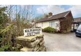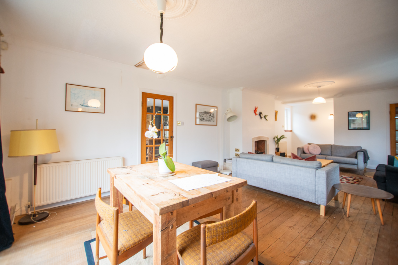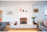 Moving further through the property, you are welcomed into a bright and inviting living/dining room with a charming built-in fireplace and patio doors. Adjacent is the generously sized kitchen, offering ample storage, a built-in hob and oven, and a lovely red Aga cooker. There is plenty of space for a dining table and chairs. Just off the kitchen, you’ll find a cold pantry, a cloakroom/WC, and internal access to the garage.